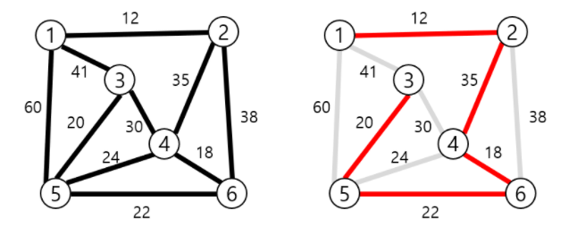 최소 스패닝 트리는 단순히 가장 가중치가 적은 간선들을 사용한다고 해서 얻어지는것이 아니다.