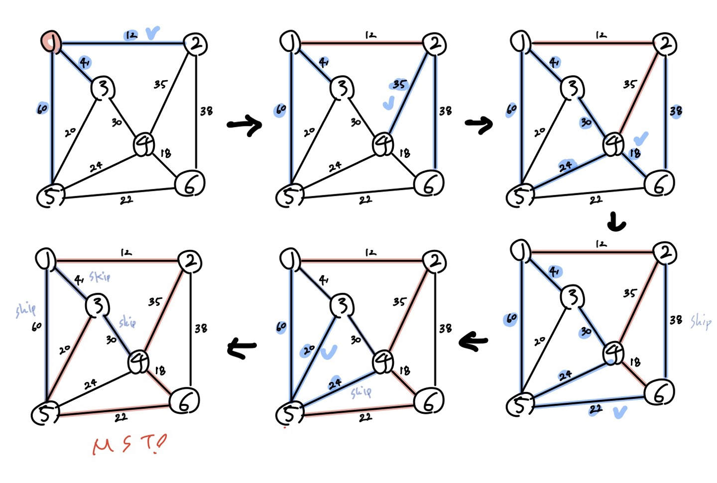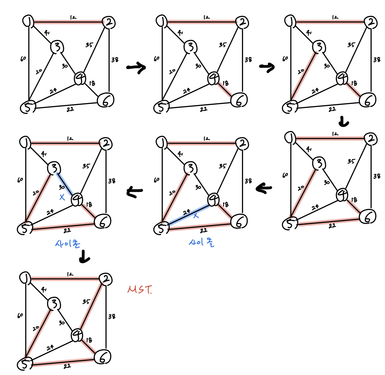 - 간선 리스트에 더 이상의 간선이 없을 때까지 3-4번을 반복