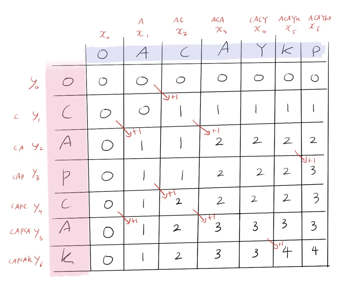 여기서 ACAYKP 를 X수열, CAPCAK를 Y수열이라 하고 X수열의 꼬리를 잘라 X가 포함하는 문자의 수로 정의한다면