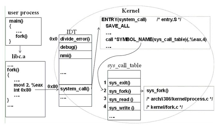 3.커널은 IDT에서 0X80주소에 있는 system call ()을 찾음