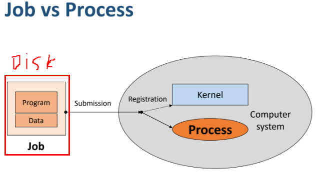 > 실행할 프로그램과 데이터를 묶은 것을 job 또는 program이라 부른다. 현재 디스크에만 있는 상태로서 컴퓨터 시스템에 실행 요청을 당하기 전의 상태이다.