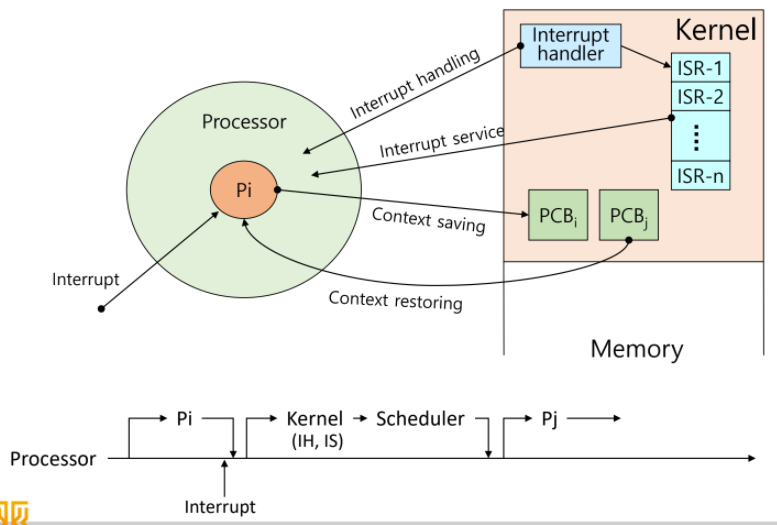 Pi 작업 도중 인터럽트가 발생하면 커널이 개입하여 프로세스를 중단하고 현재까지 작업 중이던 흐름/문맥(Context)을 잊지 않도록 Saving 하고 인터럽트를 핸들링한다 , 인터럽트를 핸들링하기 위해 어떤서비스를 할지 찾고 서비스를 해준다. 다시 본래의 작업을 하기위해 흐름을 가져와 복구를 하는데 Pi가 잠시 자리를 비운 사이 대기 중이던 다른 프로세스 Pj가 있으면 해당 프로세스를 돌리고 있으므로 Pi는 ready로 들어간다.