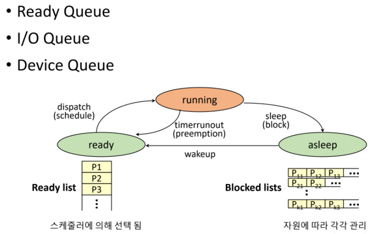 스케쥴러에 의해 프로세스가 레디 리스트 쌓이고 어떠한 자원이 필요해 Asleep에 들어간 경우 각 자원에 따라 각각 다른 리스트로 들어가 관리되며 자원을 확보하면 다시 레디 리스트로 들어간다.