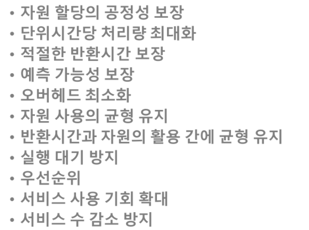 스케줄링 기법을 선택해야 할 때도 고려해야 할 사항들이 있다.