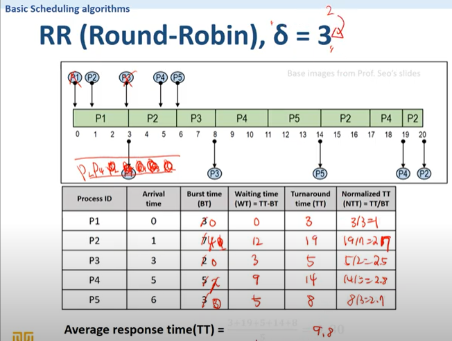 RR시스템에서는 Time quantum(제한시간의 파라미터 값)의 설정이 시스템 성능을 결정하는 핵심 요소이다.