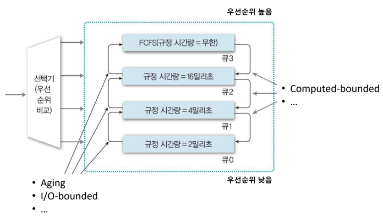 또한 starvation문제를 해결하기 위해 일정 시간을 초과하여 기다린 프로세스들은 상위 큐로 이동시키는 에이징 기법도 적용하여 MLFQ를 변형할 수 있다.