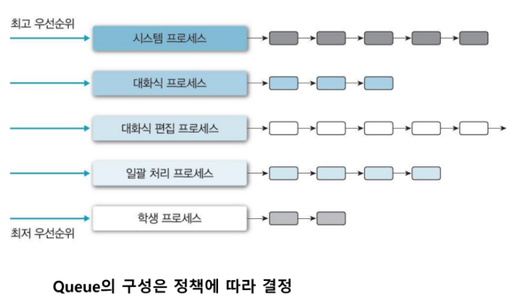 Queue사이에는 우선순위 기반의 스케줄링(fixed priority, Preemptive Scheduling...)을 사용한다.