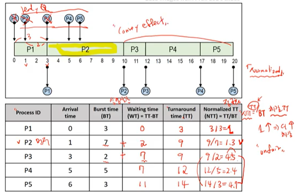 단점은 앞서 말한 대로 긴 평균 응답 시간이 있고 이처럼 긴 처리시간이 필요한 프로세스에 의해 나머지 프로세스들의 대기시간이 길어지는 (대기시간>>실행시간) 현상을 Conboy Effect 라 한다.