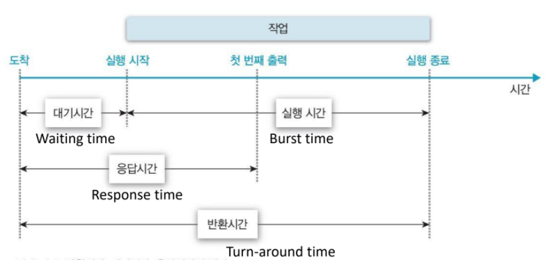 위 세 가지 시스템의 성능 지표가 있으며 각 사용자의 목적에 맞는 지표를 고려해 프로세스 스케줄링 기법을 선택하여 운용한다.