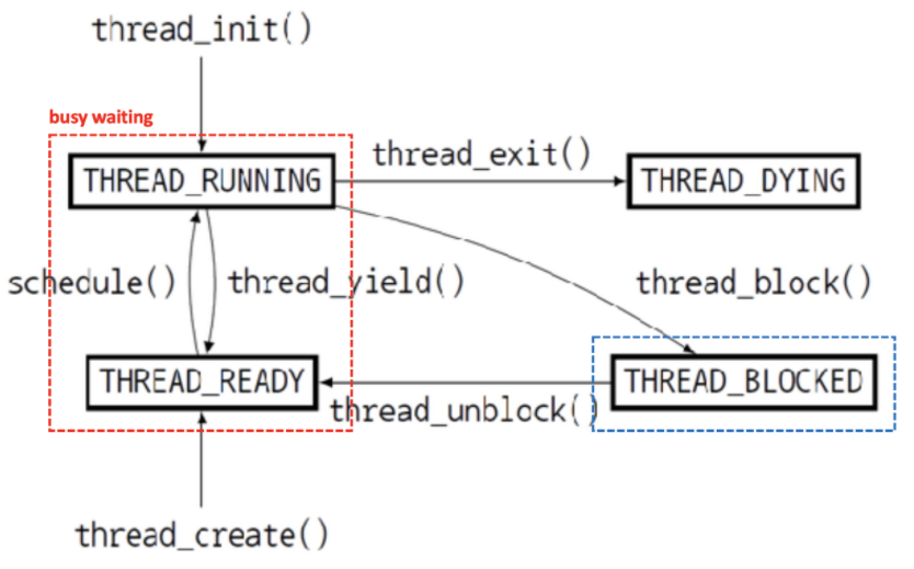 그런데 위 함수를 보면 스레드를 잠재우기 위해 thread_yield()를 호출해 일어나면 계속 ready리스트로 다시 데려다 놓는 busy waiting 방식으로 구현이 되어있다.