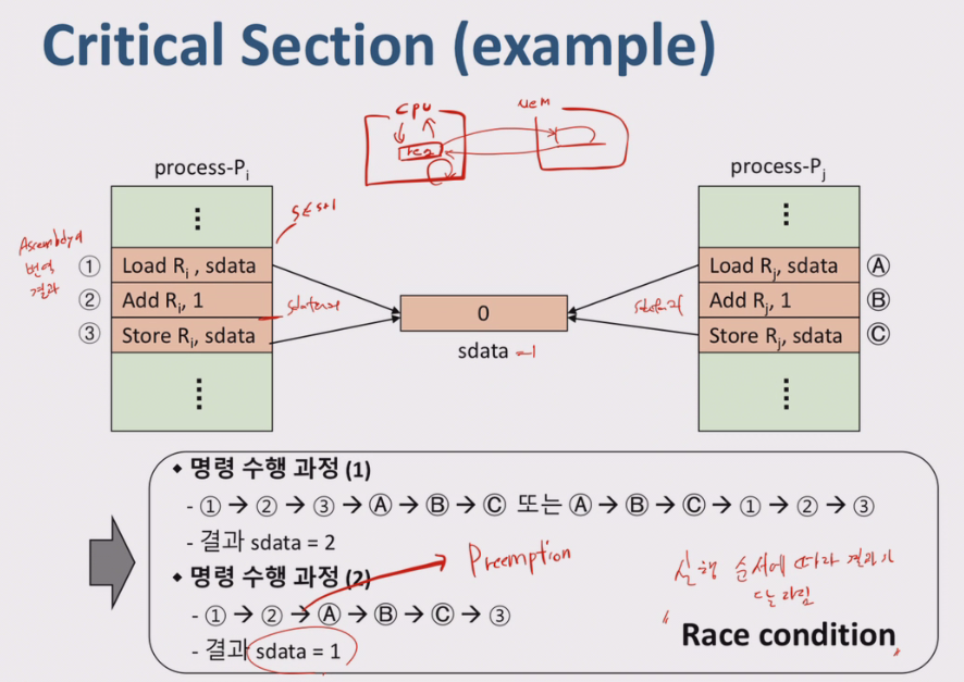 문제는 병행수행 중인 비동기적 프로세스들이 공유자원에 동시에 접근 시 문제가 발생할 수 있다.