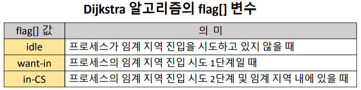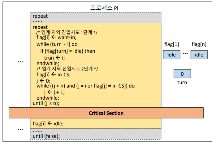 깃발을 세 단계로 나누어 프로세스가 CS영역에 진입을 시도하지 않는 단계 , 프로세스가 CS 영영에 들어가고 싶다는 의사를 표현하는 단계, 프로세스가 CS에 진입 직전 단계