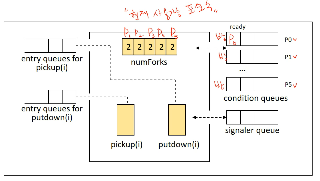 모니터에 항상 하나의 신호제공자 큐가 존재하여 signal() 명령을 실행할 프로세스가 잠시 대기하는 공간이라고 보면 된다.