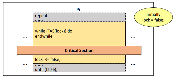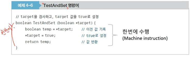 > Test와 Set을 한 번에 수행하는 기계어로 Machine instruction 이기 때문에 실행 중 interrupt를 받지 않으며(preemption 되지 않음) Atomicity 하고 나누어지지 않는다.
