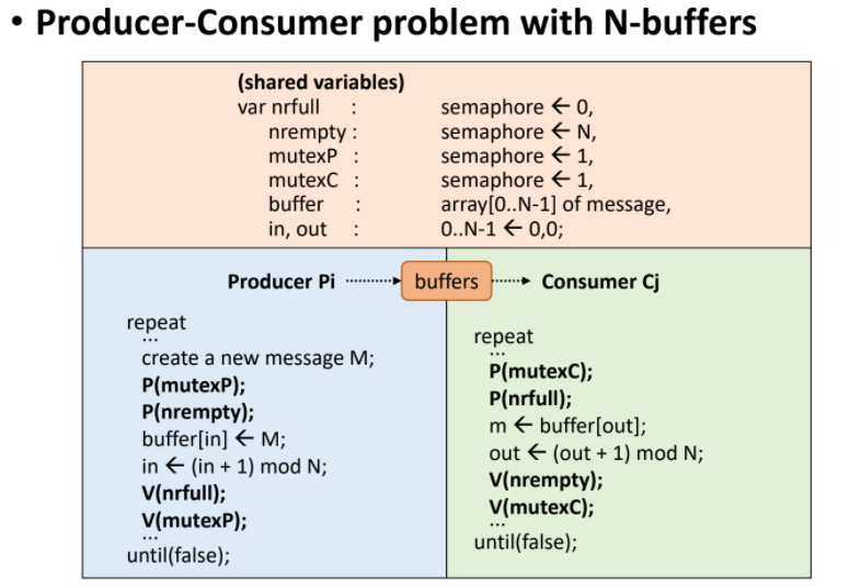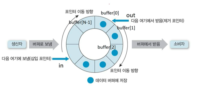 p(nrempty) 지금 버퍼 비어있니? 없으면? 공간 생길 때까지 Q에서 대기 있으면 안으로 들어감(Buffer [in]) 넣어 주었으니 다른 버퍼로 위치 갱신해주고 V(nrfull) 방금 넣은 곳의 버퍼는 채웠다고 말함