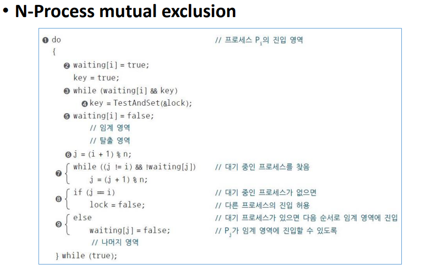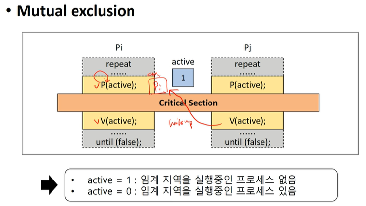 Mutual exclusion(상호 배제) > 둘 이상의 프로세스가 동시에 Critical sectio(임계 영역)에 진입하는 것을 막는 것