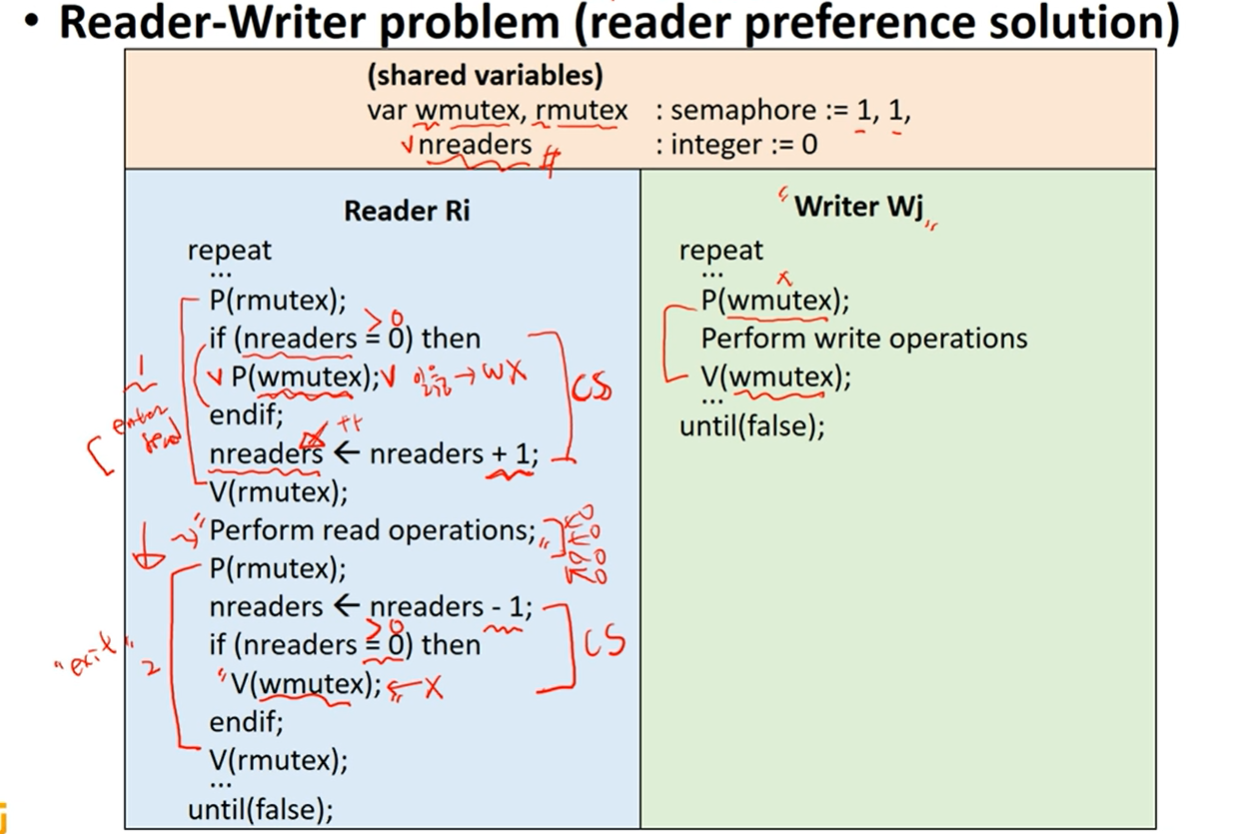 읽으러 들어가기 전 현재 몇 명이 읽고 있는지 수를 체크 만약 현재 읽고있는 리더가 없다면 Writer가 쓰고 아니라면 리더를 한 명 증가시킨다. 그 후 읽는다(Perform read operation)