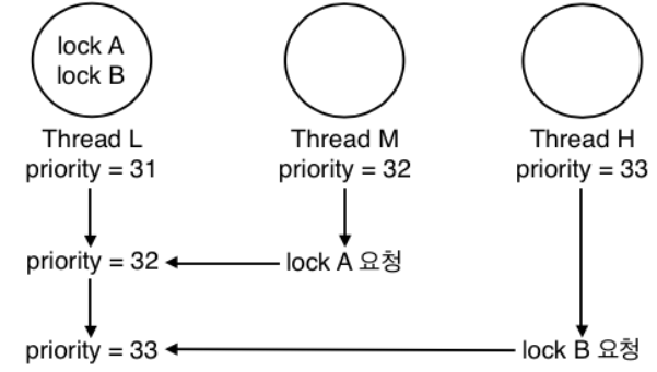 위의 예시를 보면 priority가 31인 L이 LockA와 LockB를 들고있다. 그러던중 LockA를 M이 요청하고 이것을 빨리 반납해 주기 위해 L은 M의 우선순위를 기부받아 잠시 32가 된다.