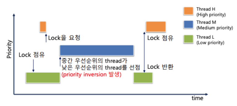 이렇게 되면 작업의 종료시기가 M->L->H가 된다. 낮은우선순위의 스레드가 먼저 작업을 마치게 되는 Priority Inversion이 발생한 것이다.