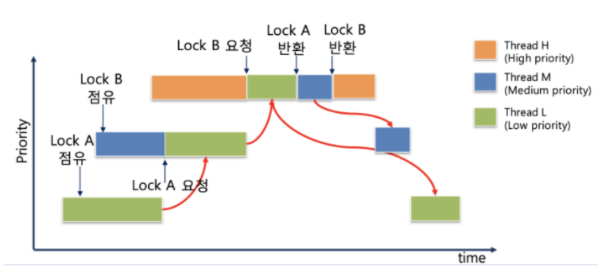 락을 하고 기다린다. M이 기다리는 LockA의 소유권자는 A이고 우선순위를 L에게 양도한다. 이때 H가들어와 lockB를 요구하지만 lockB는 M이 소유하고 있다 그러면 B를 받기위해서는 M의 우선순위를 높여주어야 한다. M이 끝나려면 L이 끝나야 하므로 M은 다시L의 우선순위를 높인다. 그렇게 L이 A를 먼저 다 쓰고 반환하면 M이 작업을 시작한다. 전체적인 흐름을 보면 아래 그림과 같다.