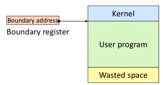파티션이 미리 나누어져 있기 때문에 이들 사이에 서로 침 번하지 않도록 방어하는 바운더리 레지스터를 두어 사용자 영역과 커널 영역을 보호할 수 있다.