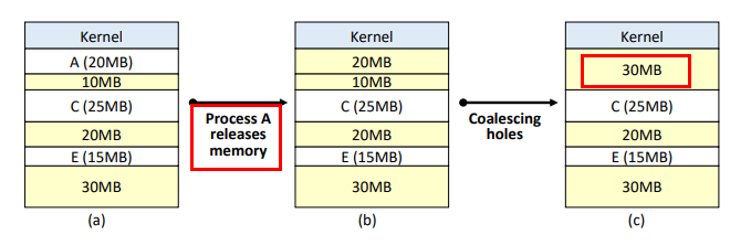 모든 빈 공간을 하나로 통합하는 방법이며 프로세스 처리에 필요한 적재 공간의 확보가 필요할 때 수행된다.