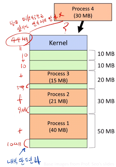 > 남은 메모리 공간들의 크기는 프로세스의 크기보다 크지만 연속된 공간이 아니라 메모리를 할당 못해 메모리가 낭비되는 현상.