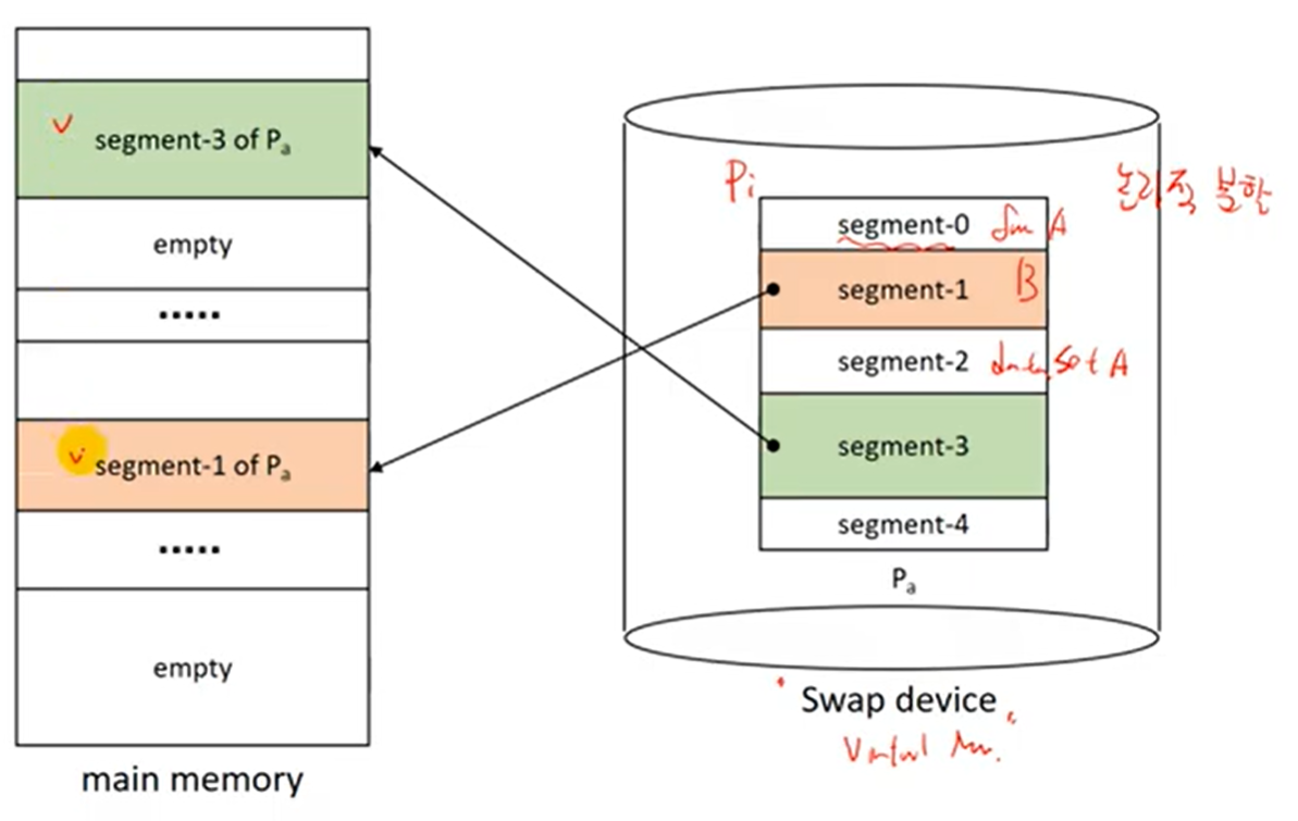 - 찾은 entry가 존재하지 않는다면? segment fault ->swap device로부터 해당 segment 메모리에 적재 후 smt갱신