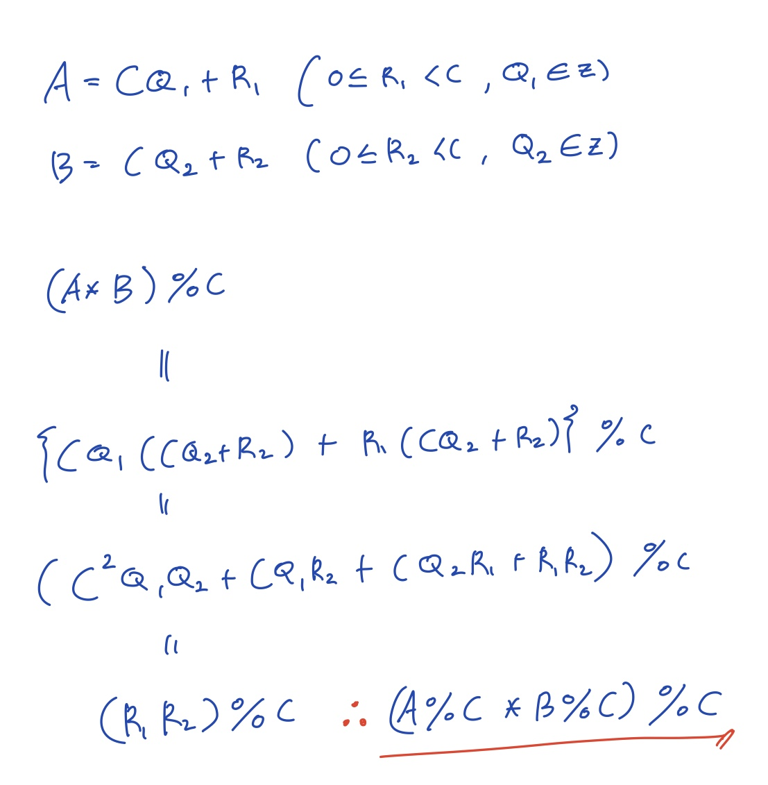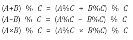 모듈러 연산이란 나머지를 구하는 연산자로 위의 분배법칙이 성립한다.