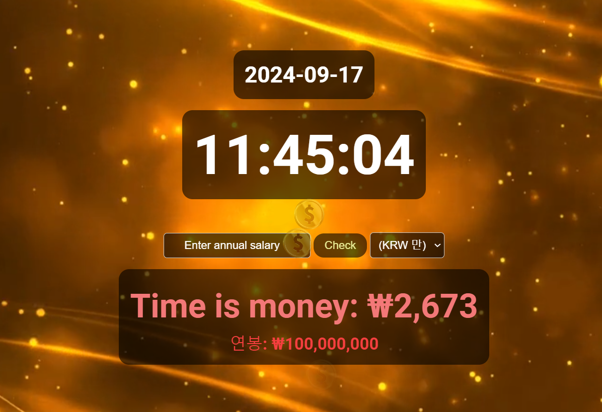 궁금한번 내가 배포한 웹페이지에 들어가서 자기 연봉 입력해서 옆에 켜두고 일해보길 권해본다 ㅎㅎ 생각보다 연봉이 많아야 초당 버는 금액이 많다는걸 깨달을 거다.