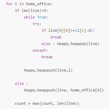 - 오른쪽 원소를 기준으로 차례대로 home_office의 원소들의 길이를 검사하여 기준이 되는 점의 오른쪽으로부터 d보다 작은 경우는 heappop을 해주고 아닌 경우 heappush를 해준다